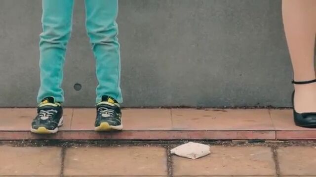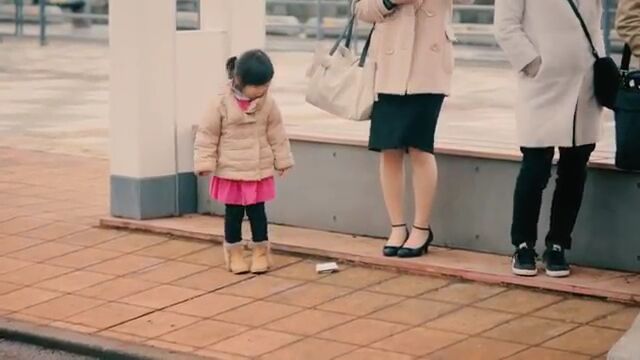 お母さんに頼まれてバス待ちの行列に並ぶ子供たち。一人きりで不安そうにキョロキョロしていると、目の前の大人がポケットから財布を取り落とす。