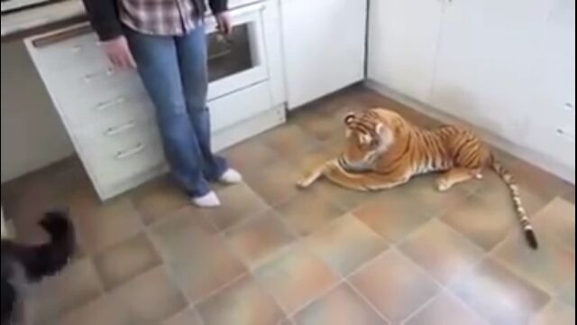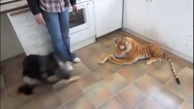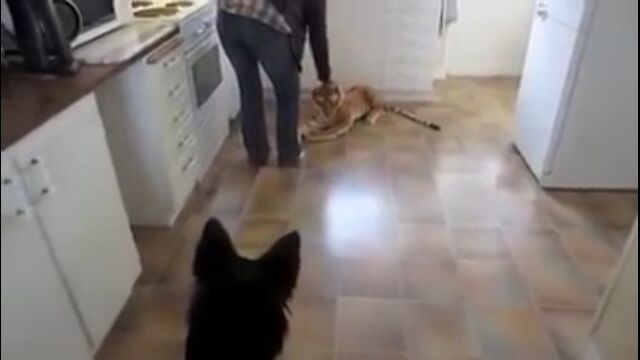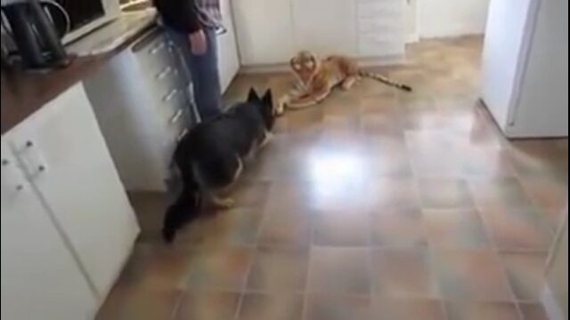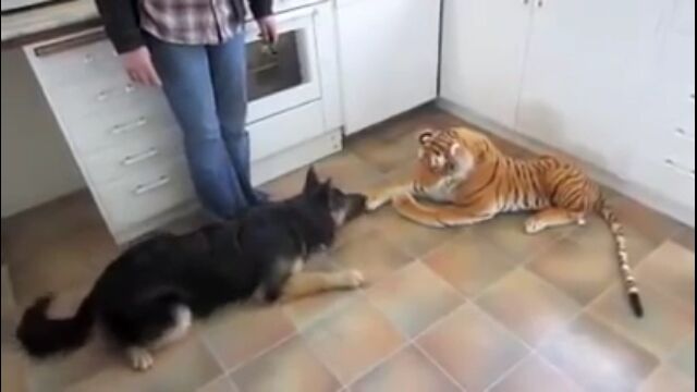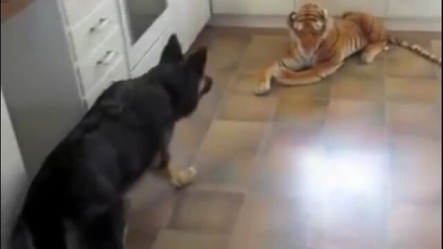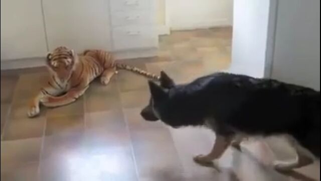この荒い画質で遠目に見ると、「あれ?本物のトラかな?」と思ってしまう程度にはよくできたトラのぬいぐるみを相手に、おっかなびっくり接するジャーマン・シェパードくん。
