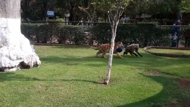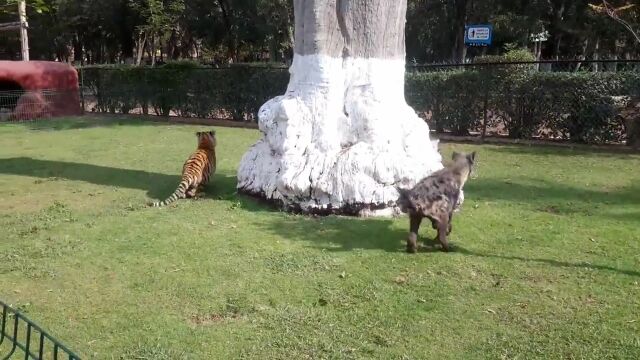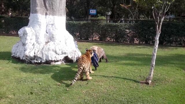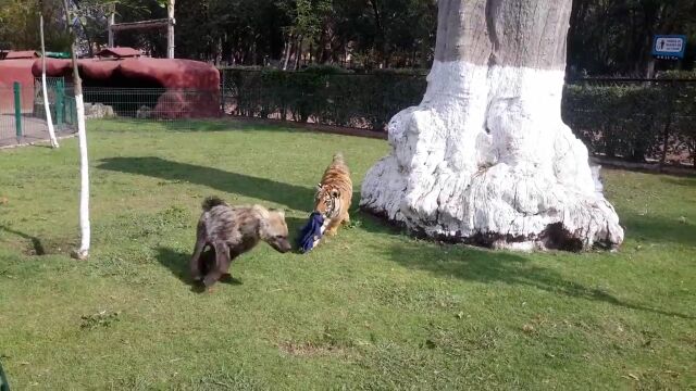 トラはもっと引っ張り合いで遊びたくて、ハイエナを誘ってるように見えるね。