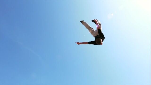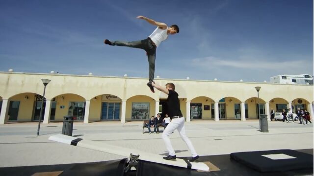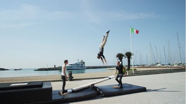 サーカスで使われるタイプのシーソー、ティーターボードを使ったアクロバット映像。