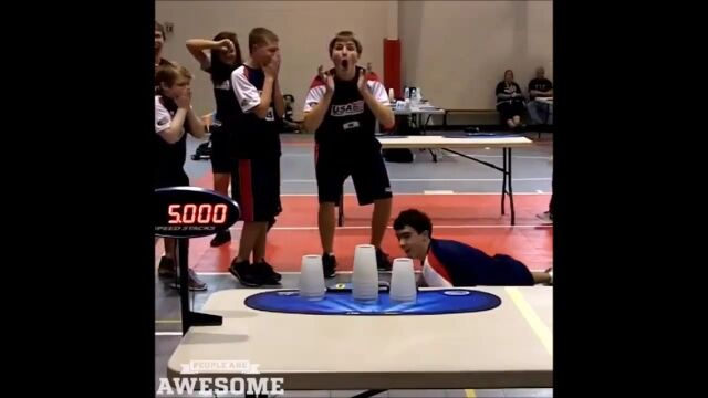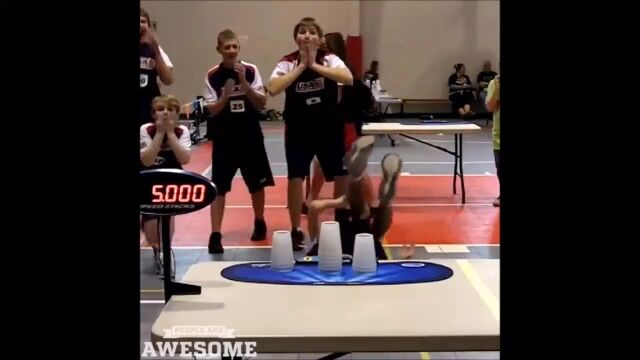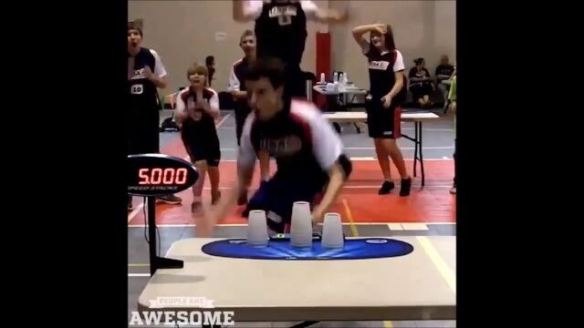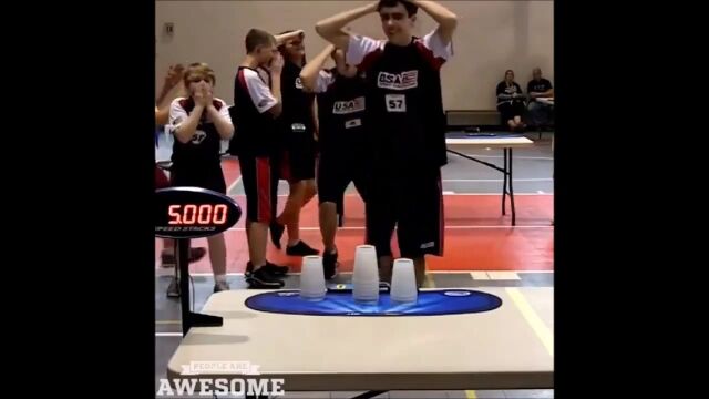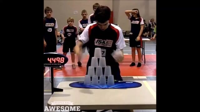 ルーチン通りにカップを積み上げて崩してを繰り返す、スポーツスタッキングのサイクルスタックという競技において、5秒ジャストで最速記録を叩きだしたウィリアム・オレル少年の映像。
