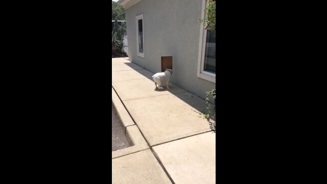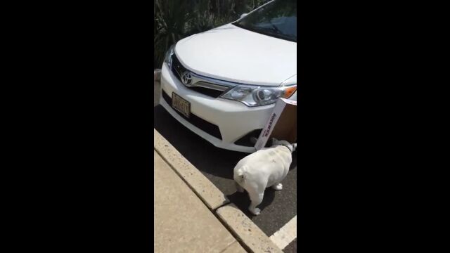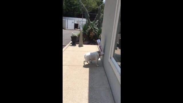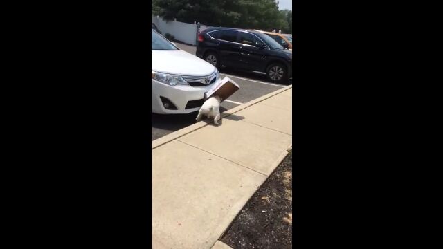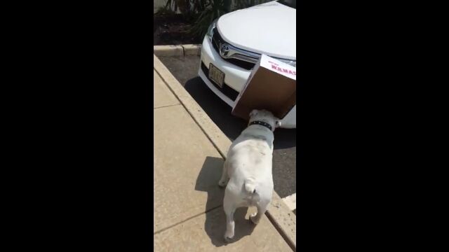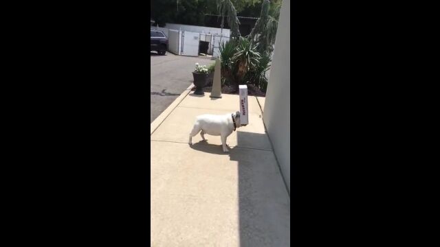しかし、どんなに前が見えなくても、ダンボール箱を離すことはしない、ダンボール箱が大好きなブルドッグ犬のディーゼルくん。