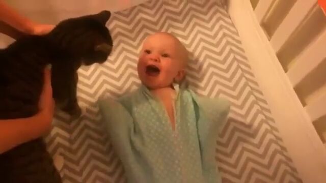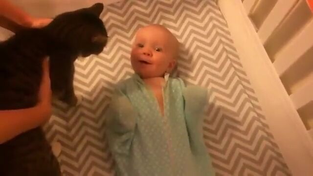 お母さんが猫を抱きかかえて近づくと、大興奮でジタバタ喜んじゃう赤ちゃんが可愛すぎる。