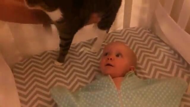 猫を見てはジタバタ、近づけるとジタバタ、ベビーベッドの上を歩く様子を見てジタバタ。