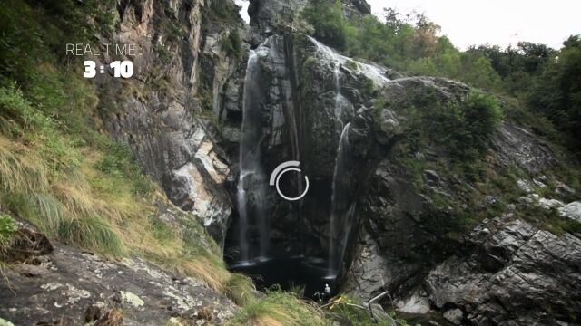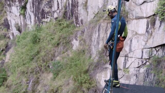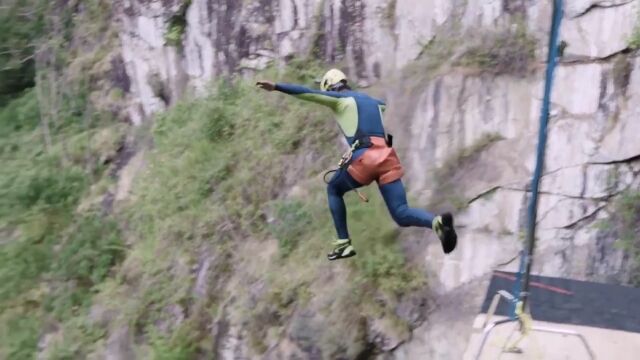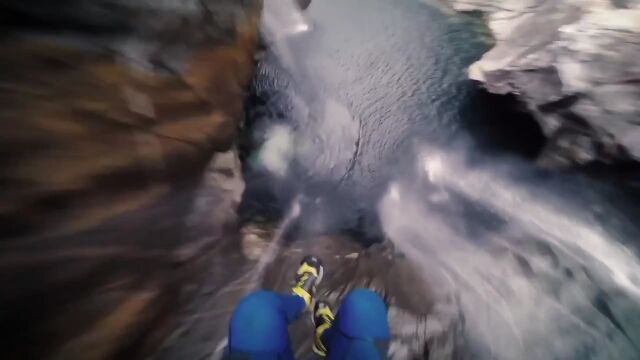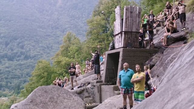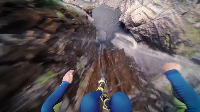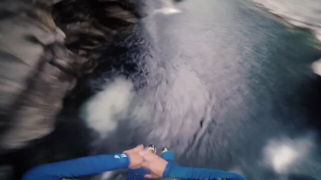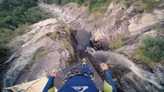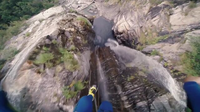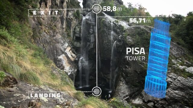 スイス、マッジャにある滝の滝壺めがけ、ピサの斜塔を越える59メートル弱の高さから飛び降り、飛び込む映像。