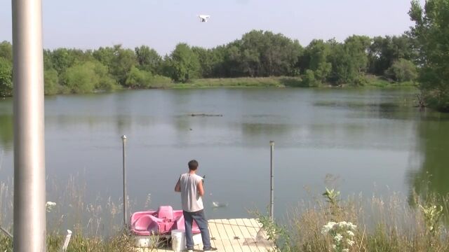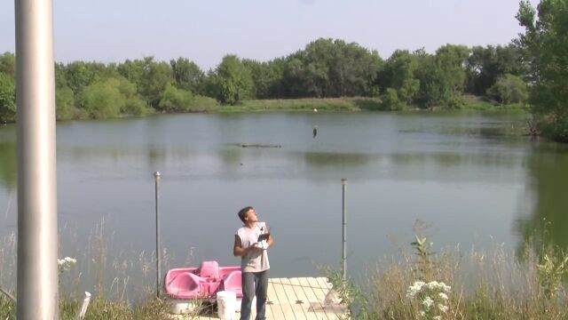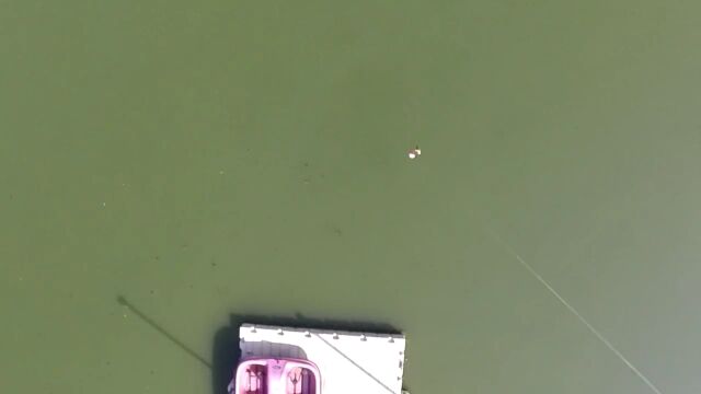 釣り糸と針に絡まった魚が重たいラジコンごと湖に
