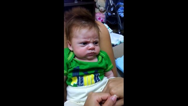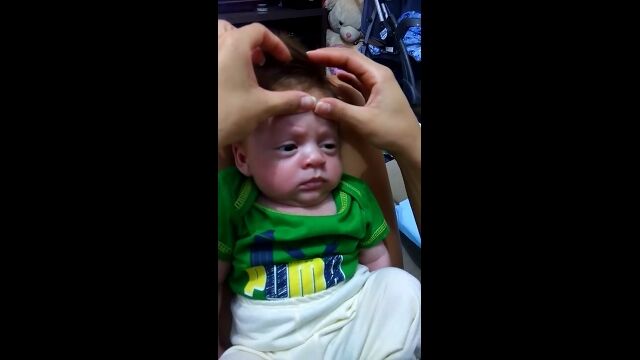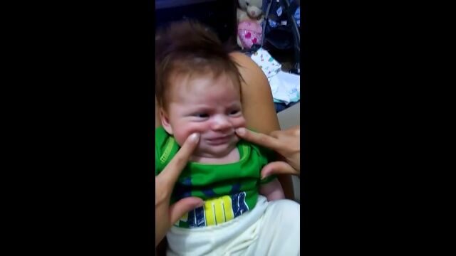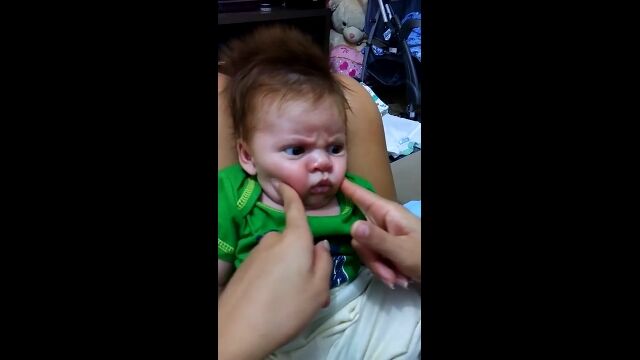 おでこを上げてもほっぺを挟んでもしかめっ面でい続けようとする赤ちゃんが可愛い映像。