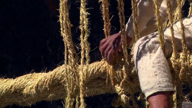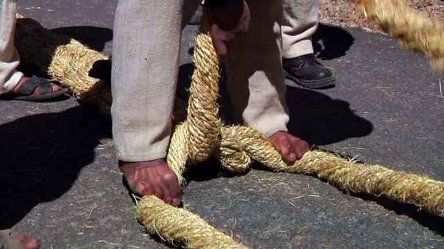 村人総出で細い縄をどんどん編み込んで太くしていき、古い端のあった場所まで運び、綱引きのようにピンと張って岩に固定。