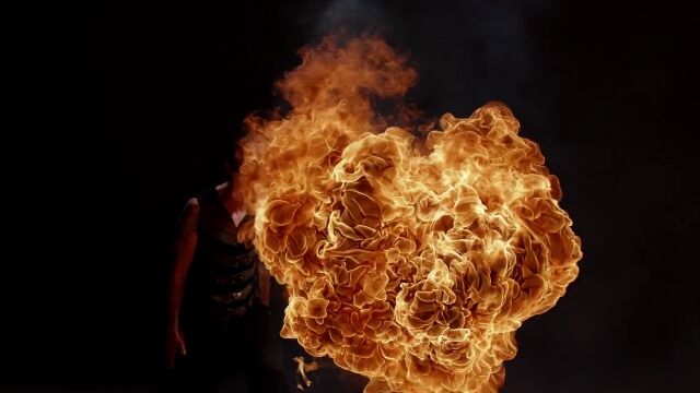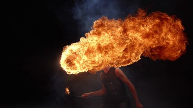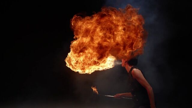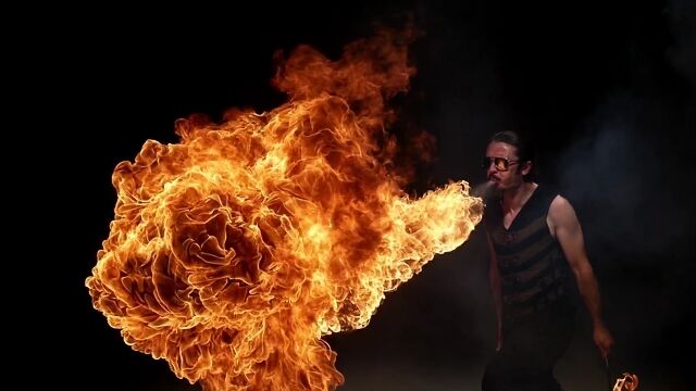 映画「マトリックス」のバレットタイム撮影の手法を使って撮影した、火吹きの瞬間の影像。