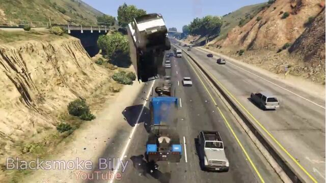 まるでジャンプ台がそのまま走行しているような形のトラックを作り、高速道路上の車たちを空へとふっ飛ばしていくゲームプレイ映像が豪快すぎた。