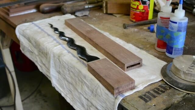 紙に描いた刃の形にあわせて、丸鋸やドリルで削って整えていき、木製の鞘と柄を組み合わせていく。