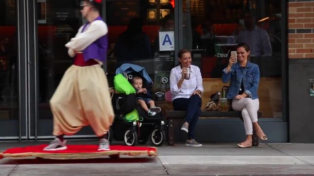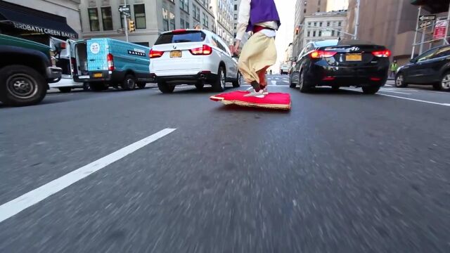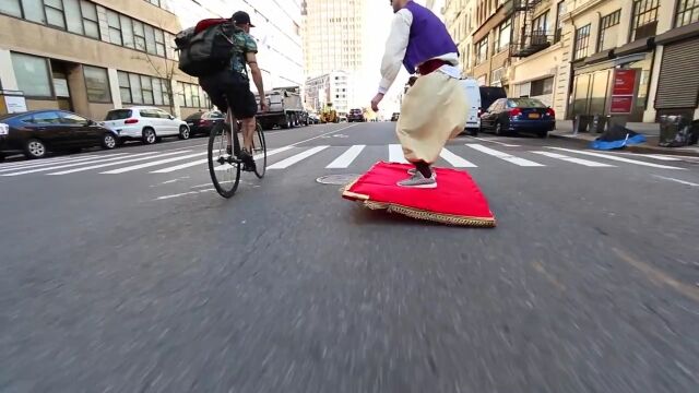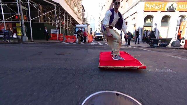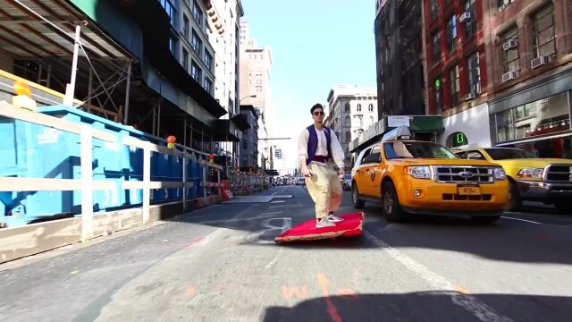 ディズニー映画「アラジン」のコスプレで魔法の絨毯に乗り、ニューヨーク市内を走行してみた映像。