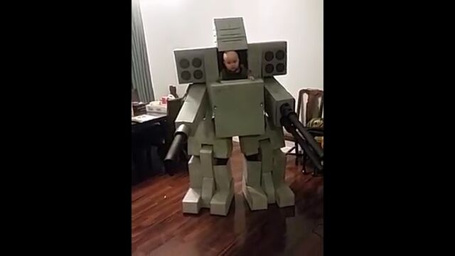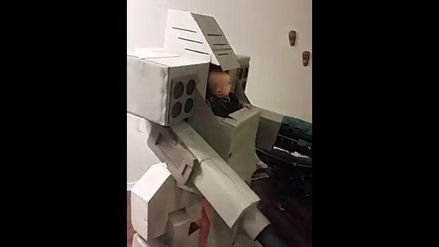 まるで赤ちゃんが操縦しているかのような、二足歩行ロボットのコスプレで頑張るパパ。