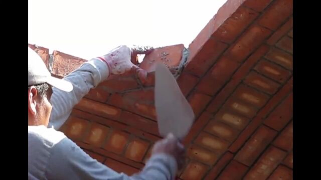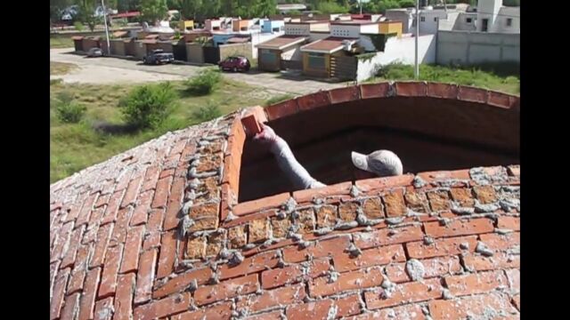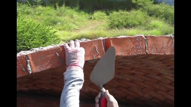 ドームの周囲から中心に向かってレンガをセメントで貼り付けていき、長さの合わない部分や角はレンガを砕いて適切な大きさに調整していく。