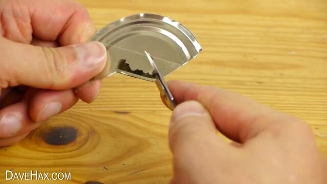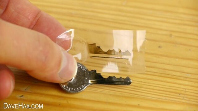 セロハンテープを貼り付けた缶詰の蓋を、煤の通りに切り抜くだけで、簡単手軽なスペアキーの出来上がり。