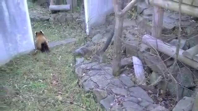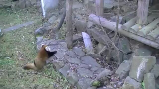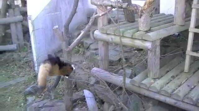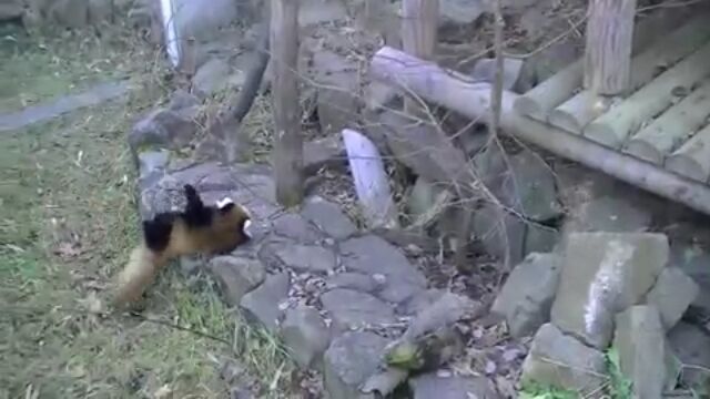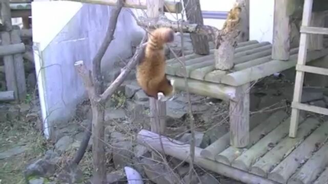 必至な所が最高に可愛い!赤ちゃんレッサーパンダ、初めての丸太渡り