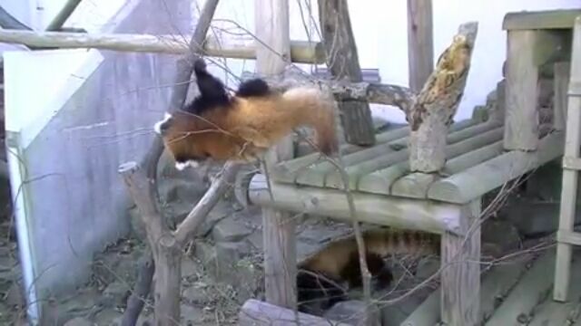 直立するレッサーパンダの風太の息子、ジャンプするレッサーパンダのユウタ