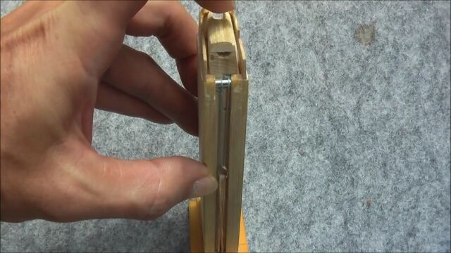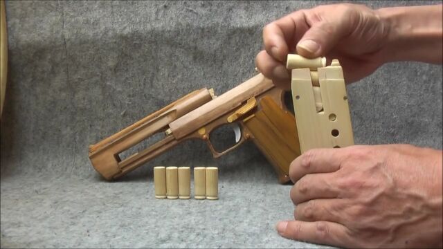 撃ち出す弾丸は輪ゴムだけど、撃つたびに木製の薬莢が飛び出すブローバック作動方式を採用。