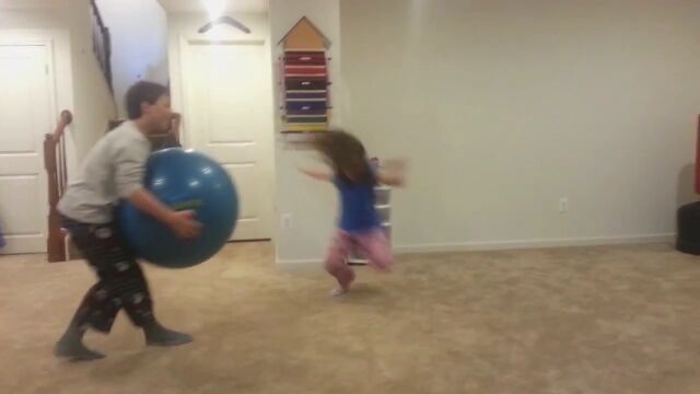 バランスボールを抱えた状態で体当りしてみたり、ボールを蹴ろうとしてすっ転んだり、思い切り投げたボールが自分に跳ね返ってきたり。
