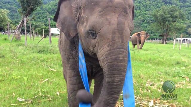 タイ、チェンマイにあるエレファント・ネイチャーパークのゾウ、ファー・マイさんは、ホースが大のお気に入り。
