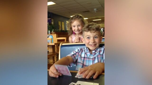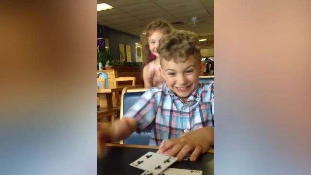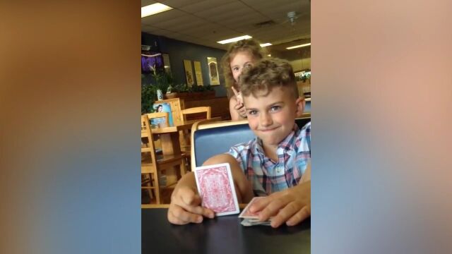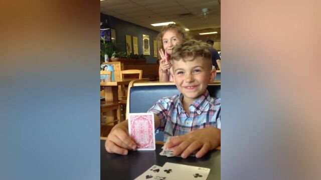 トランプカードの数字を当てるゲームで楽しむパパと息子。