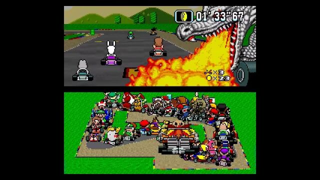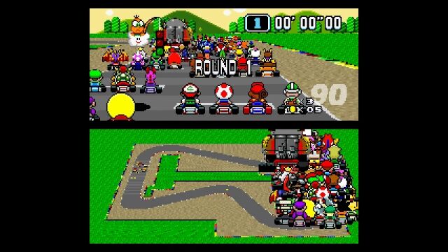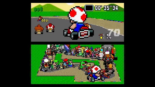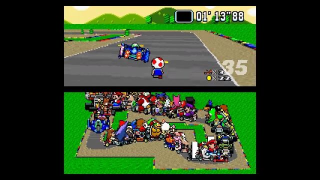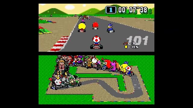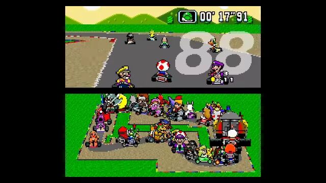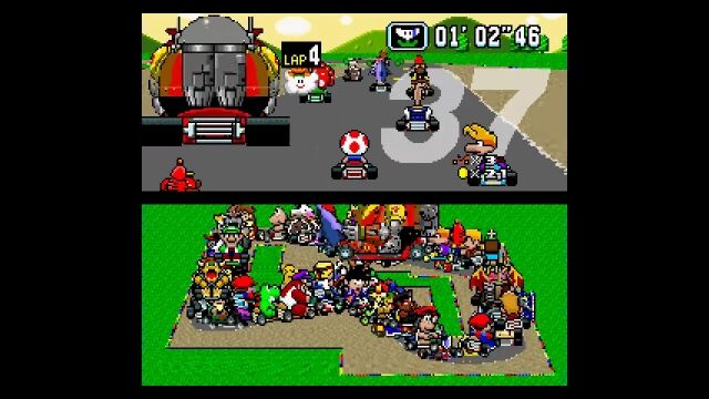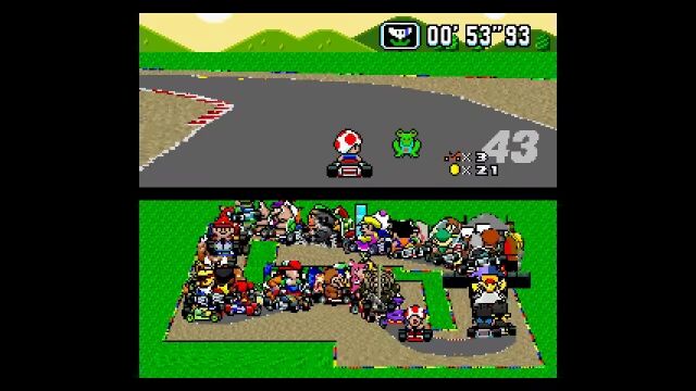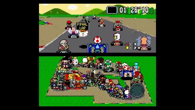 マリオカートシリーズ1作目、スーパーファミコン版の「スーパーマリオカート」にて、もしも101人同時対戦モードが存在したとしたらこんな感じというゲームプレイ風アニメーション。