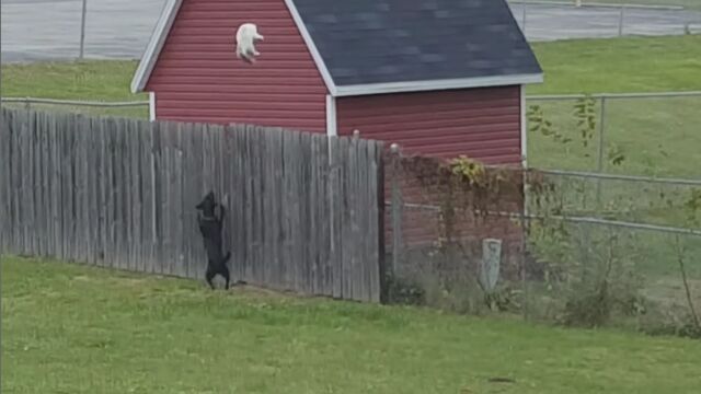 猫を除外すべき侵入者だと判断した黒犬が一直線に駆けていくと、即座に逃げ出す白猫。