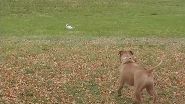 広い庭の真ん中でくつろぐ白猫の前に現れたのは茶色と黒色の2匹の犬。
