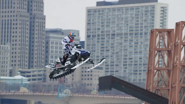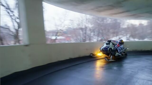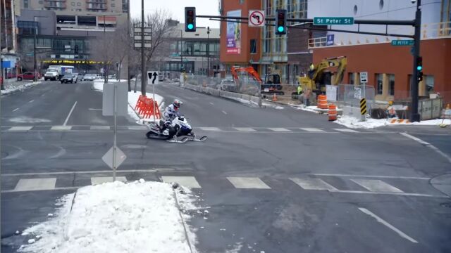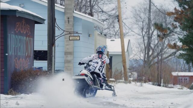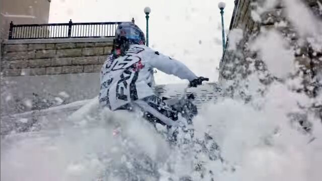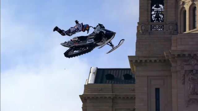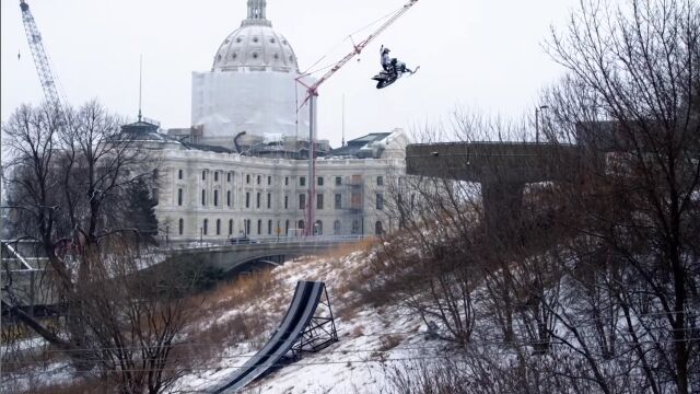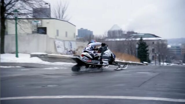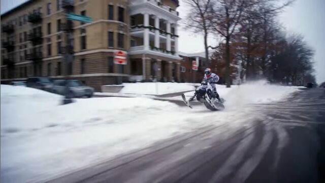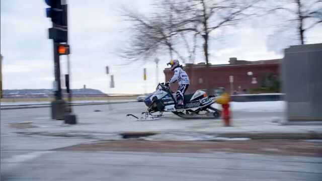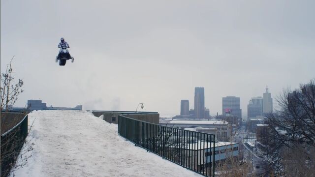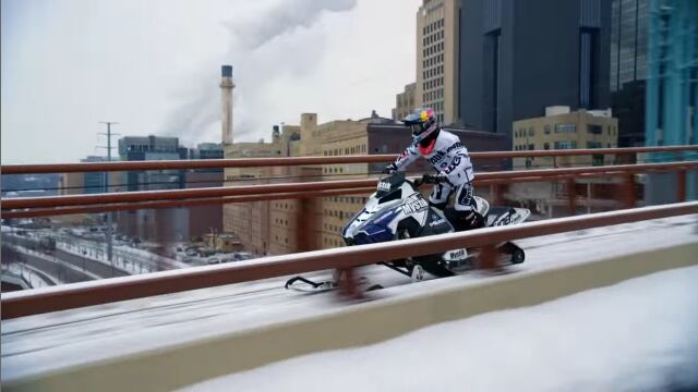 アメリカ、ミネソタ州セントポールの街中を、スノーモービルで駆け巡る、レヴィ・ラヴァレによるエクストリーム映像。