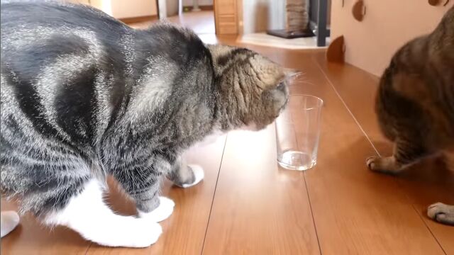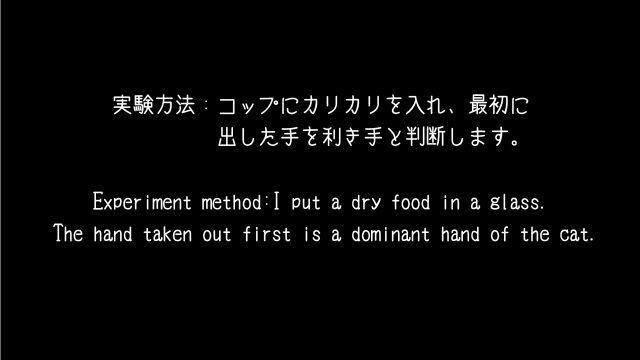 エサをコップの中に入れ、左右どちらの前足を最初に使ってエサを取るのかで利き手を調べる実験映像。