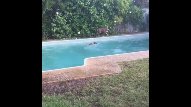 偶然か、わざとか、プールにオモチャを落とした犬。