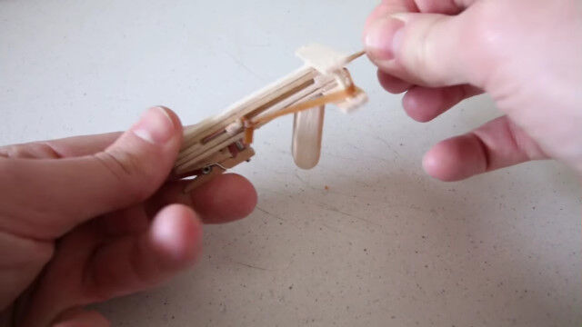 アイスの棒をメイン素材に、輪ゴムや小さな洗濯バサミを組み合わせた、小型クロスボウの作り方。