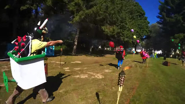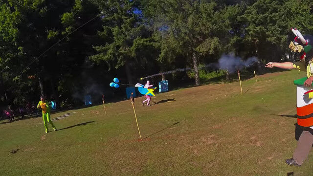 手作りのカートもどきに風船をくくりつけ、はてなボックスから入手した連発花火で対戦相手たちの風船を狙い撃つ。