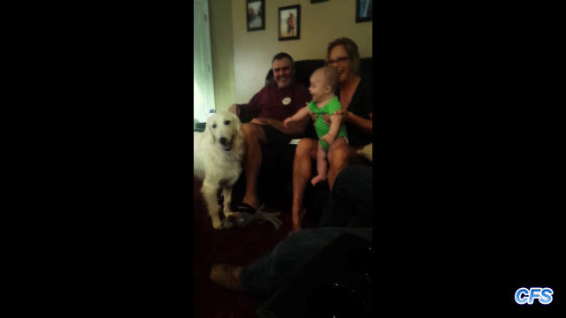 大好きなパパが帰ってきた!興奮しまくる赤ちゃんと、興奮しまくる犬