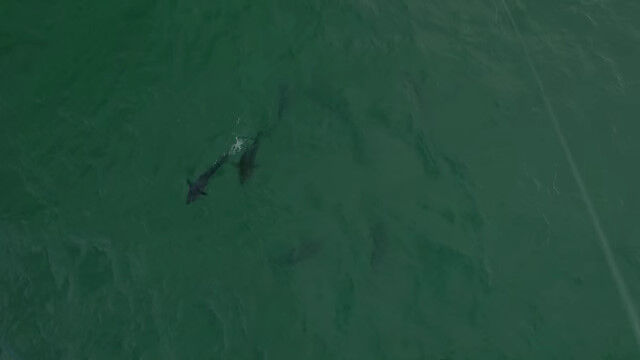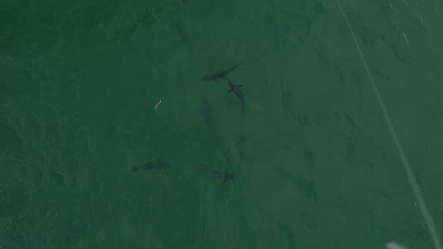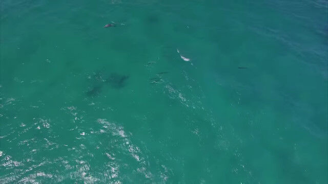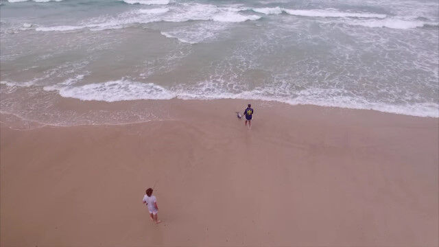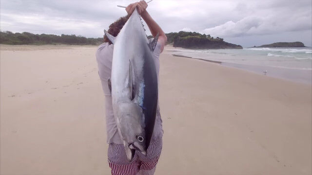 エサのイカはドローンで運び、眼下にマグロの魚影が見えたら投下。そのままマグロが食らいつくまで観察し、ヒットしたらビーチの釣り人がどんどんリールを巻き上げる。
