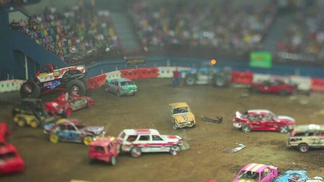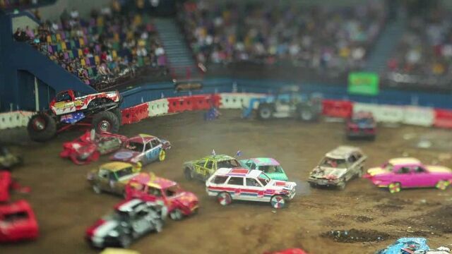 周囲のピントをボカした状態で撮影する逆ティルトの手法を使い、モーターイベントをコマ撮り撮影した映像。