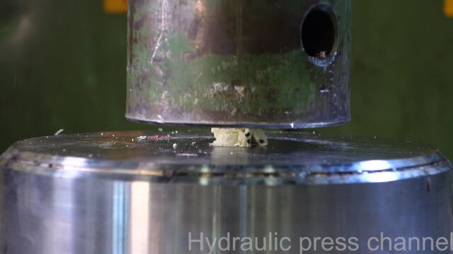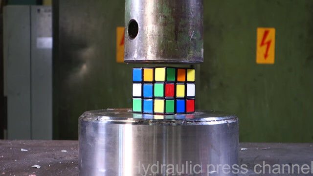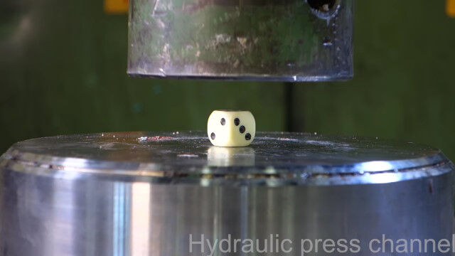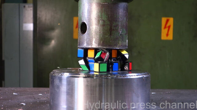 強い圧力をかけることができる油圧プレス機械を使い、トランプとルービックキューブとサイコロを押しつぶす実験映像。