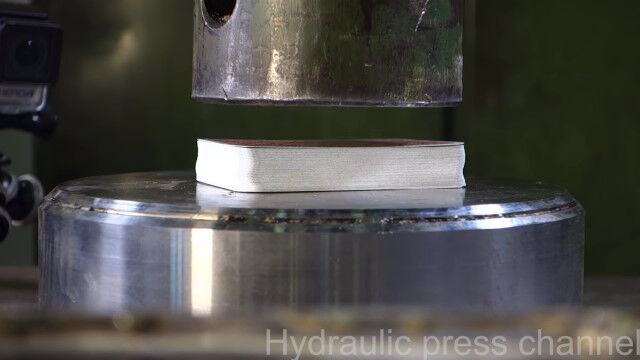 分厚い本を油圧プレスの圧倒的圧力で押しつぶす実験映像