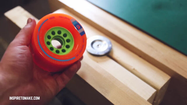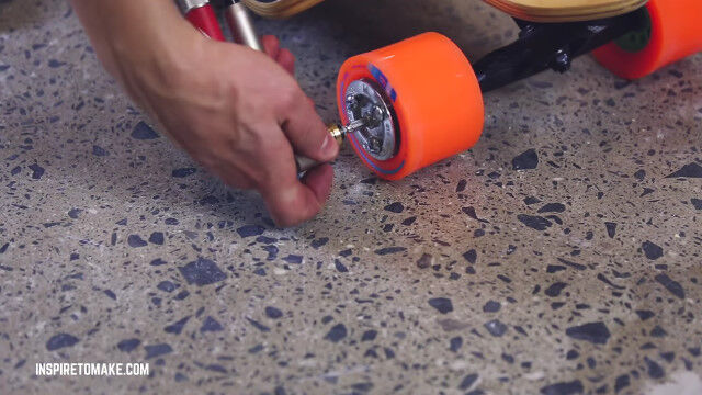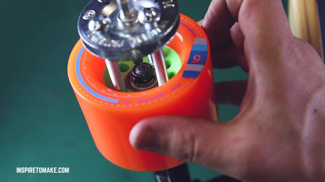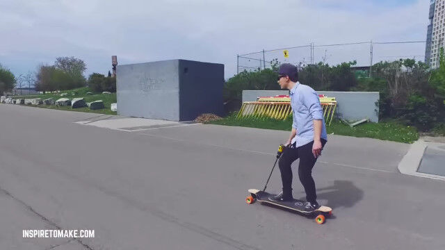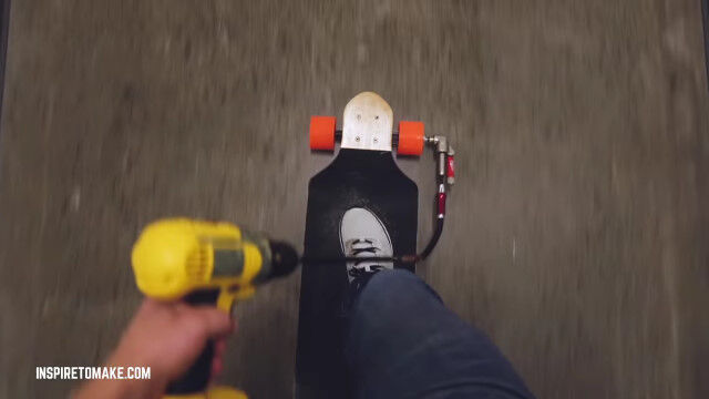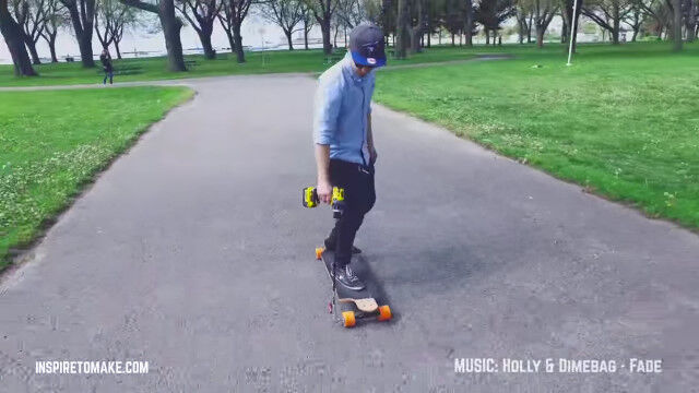 電動ドリルの回転を、スケートボードのローラーに伝えることで動く、手作りの電動スケートボード。