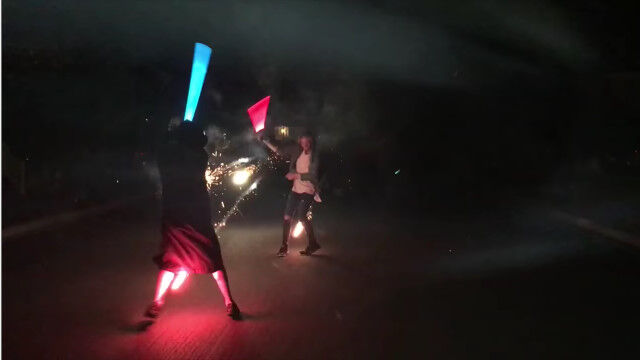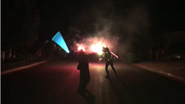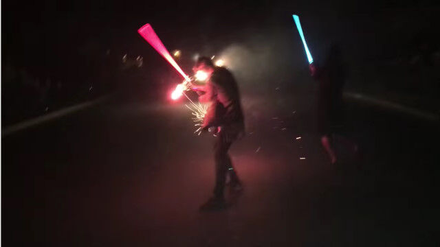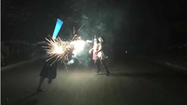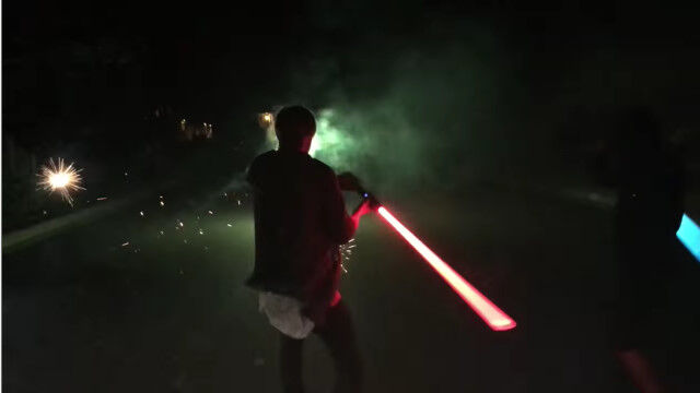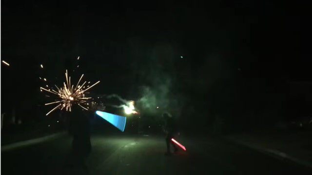 ライトセイバーでレーザー光線を切り落とし、跳ね返すジェダイの騎士を目指し、360連発花火をライトセイバーで防ぐ2人の男。
