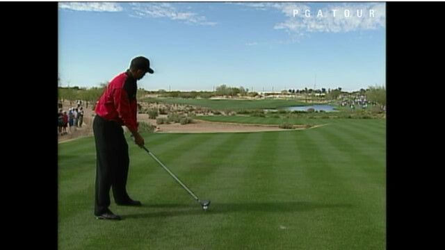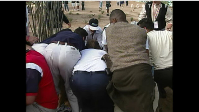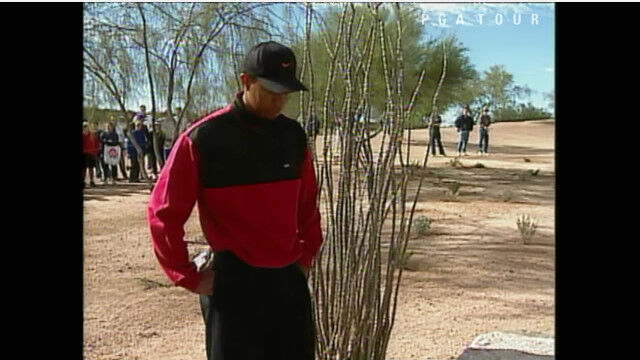 1999年のフェニックス・オープンにて、コース脇の大きな岩の手前にボールを落としてしまったタイガー・ウッズ。