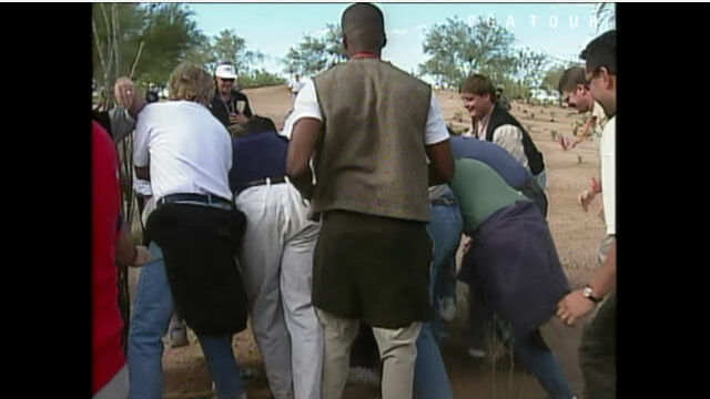 ボールを打つにはどうにも岩が邪魔。だけど、ゴルフのルール上、“動かせる障害物”は移動させて打ってもいいことになっているらしく、タイガー・ウッズを見守っていたファンたちは力を合わせて岩を移動。