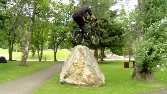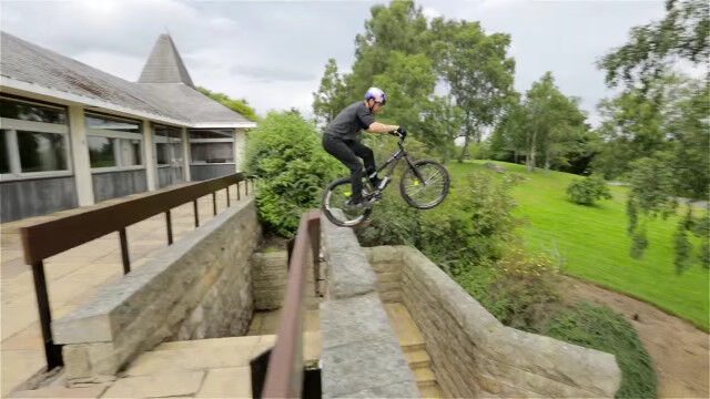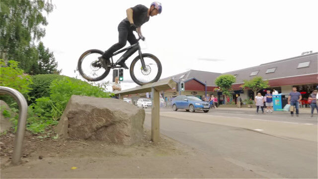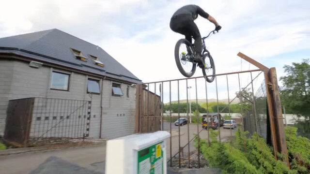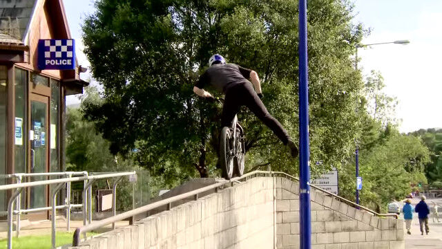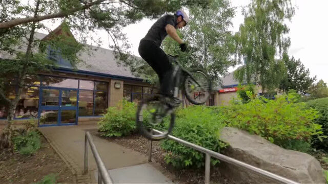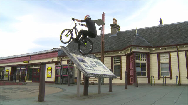 イギリス、アビモアの街中をトライアルバイクで飛び渡る、ダニー・マッカスキルによるバイクトライアル映像。