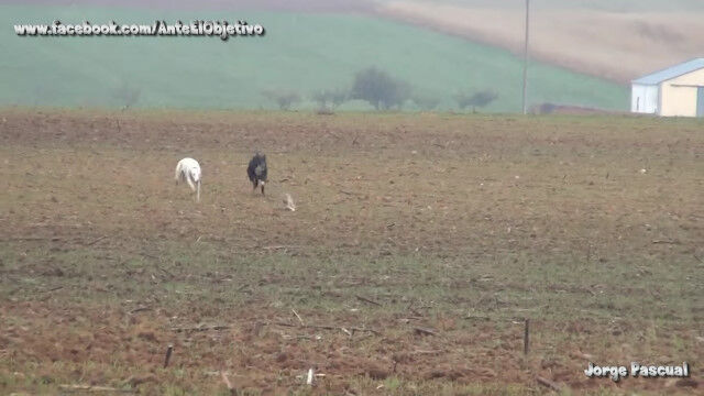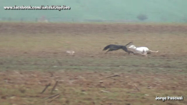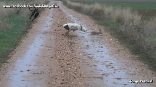野ウサギを見つけて追い立てる2匹のグレイハウンドと、恐るべき追跡者から必死に逃げる野ウサギ。