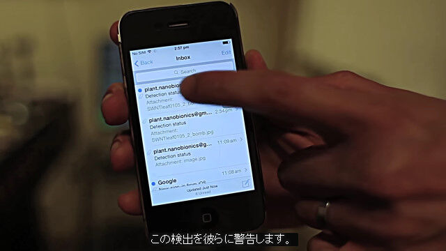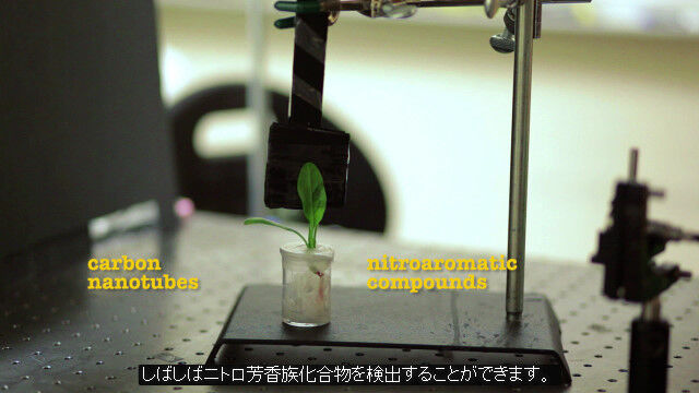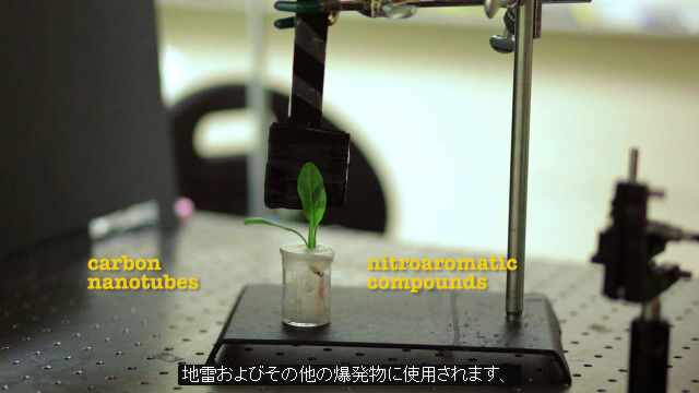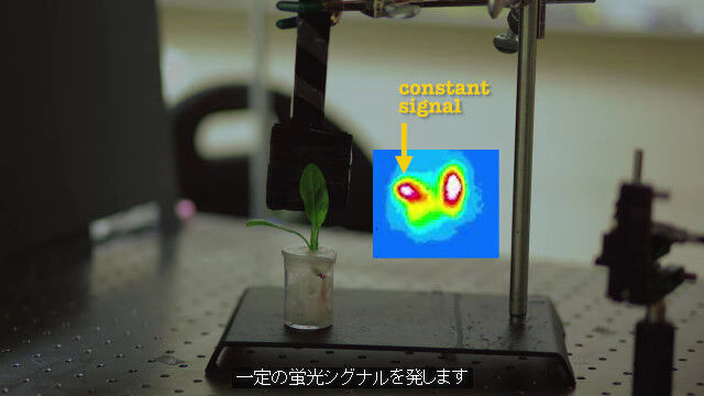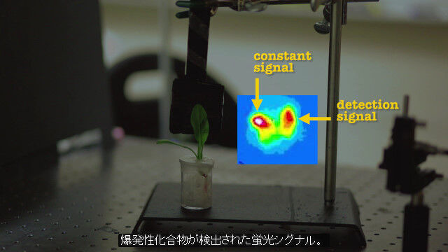 このホウレン草は、地雷などの爆発物に使われる芳香族ニトロ化合物が含まれる地下水を吸い上げると、葉脈が発する蛍光シグナルが変化。