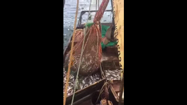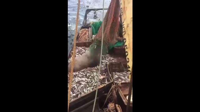 網を使った漁で、予想外の大物を捕らえてしまったロシアの漁師たち。