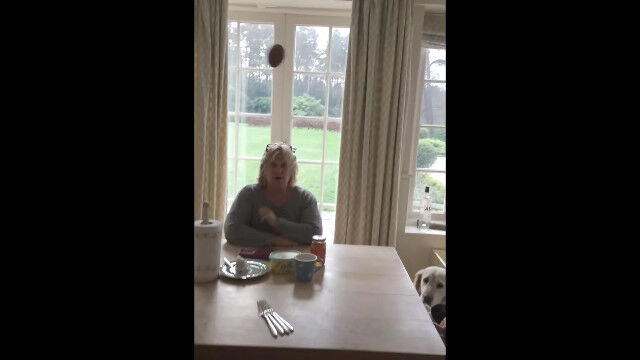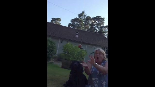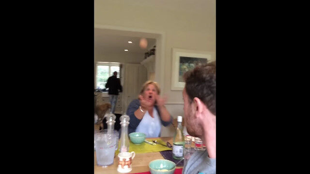 生卵をいきなり放り投げるイタズラで、慌ててキャッチする父ちゃんを撮影した映像集