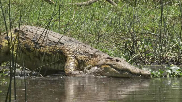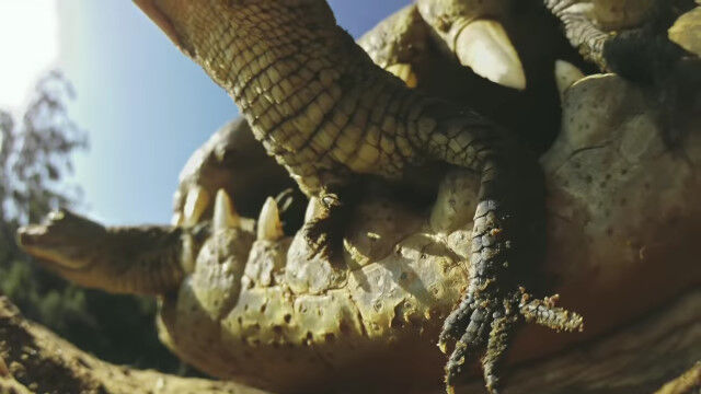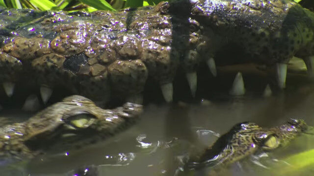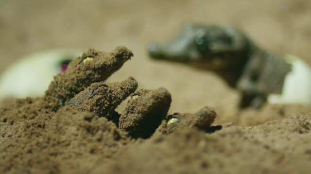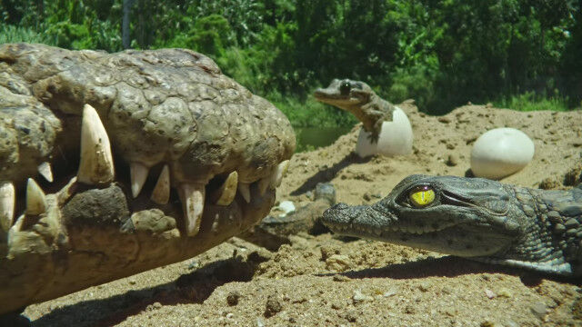 卵から生まれたばかりの赤ちゃんワニに似せたスパイカメラが撮影した、ワニのお母さんと赤ちゃんの映像。