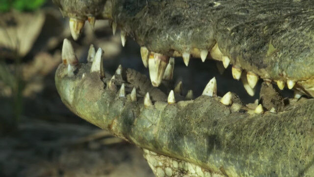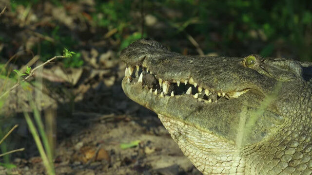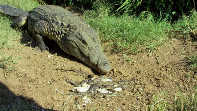 卵からかえり、砂の中から出てきたばかりの赤ちゃんワニたちを、安全な水辺へと口内に入れて運ぶお母さんワニ。