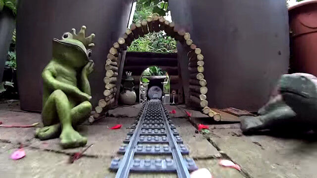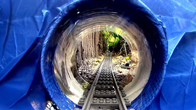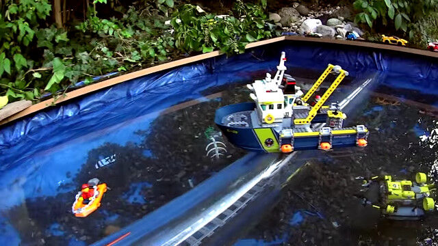 庭に作った水槽の中に透明パイプを通し、海底トンネルにしてレゴトレインを走らせてみた映像。